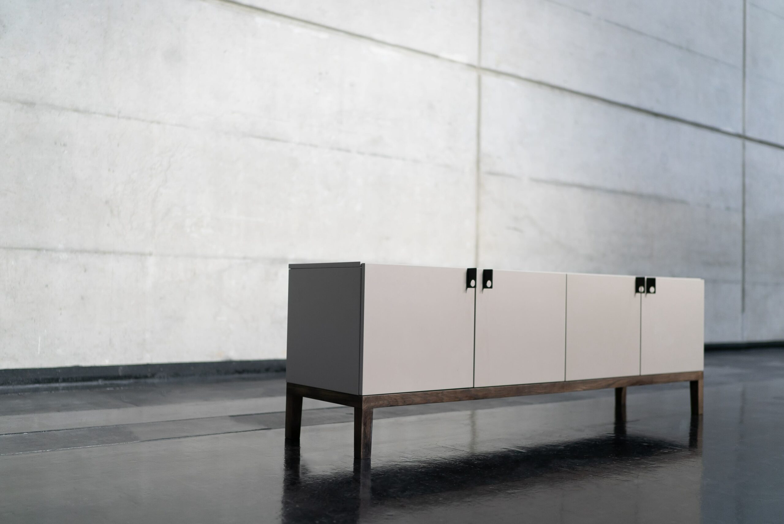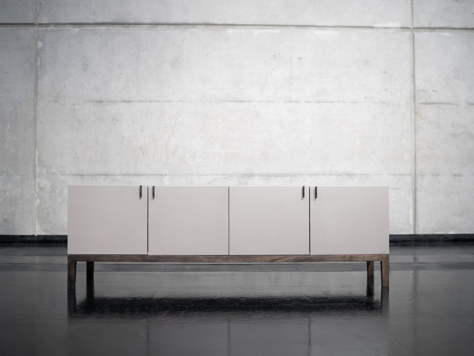 Das Sideboard ist in zwei Ausführungen, entweder mit vier Türen oder mit zwei Türen und drei Schubladen verfügbar.