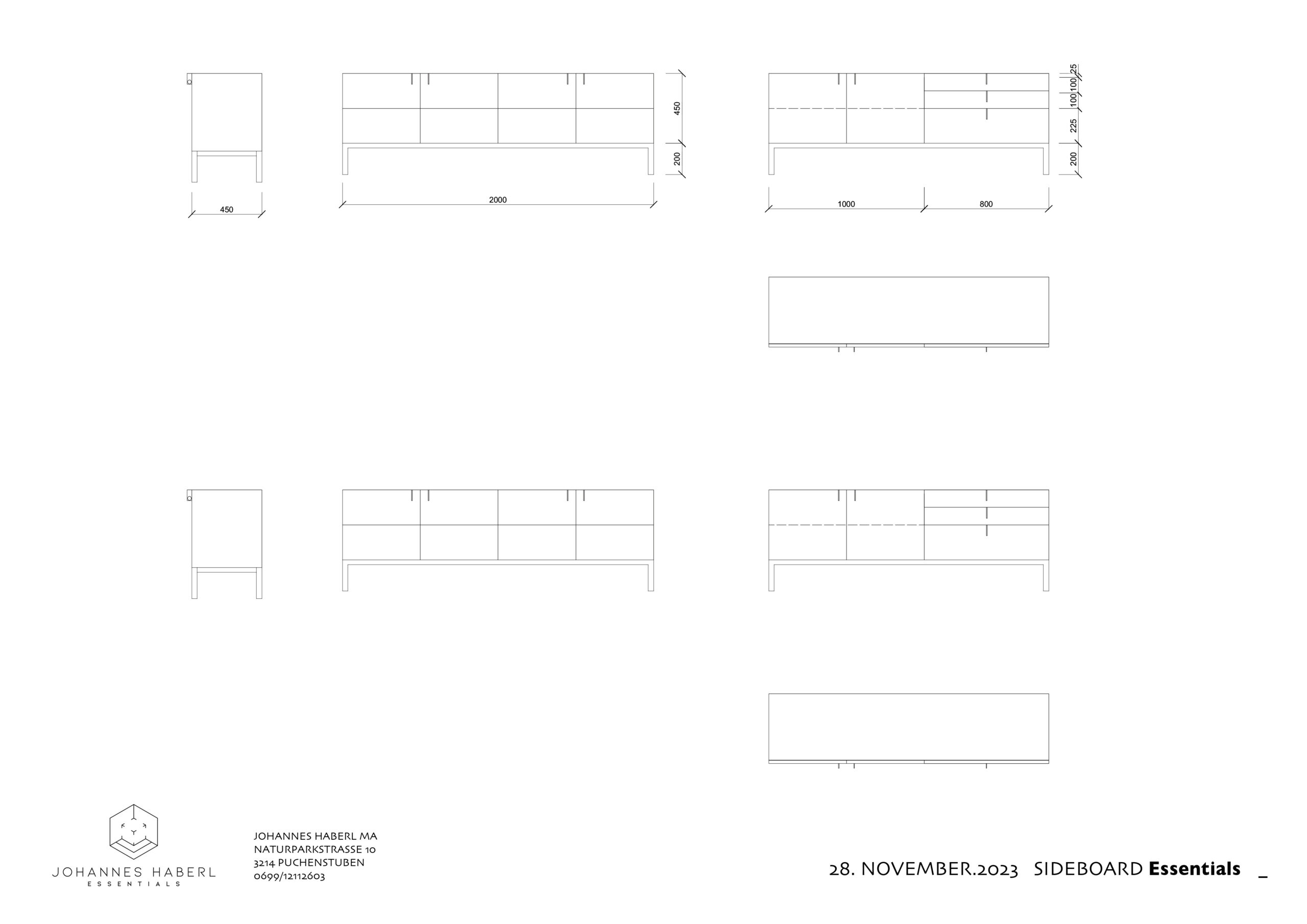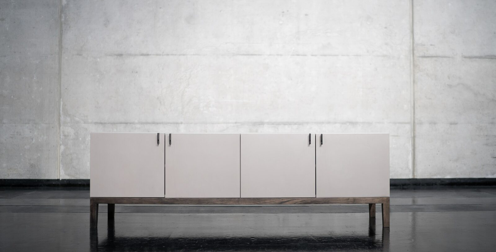 Das Sideboard ist in zwei Ausführungen, entweder mit vier Türen oder mit zwei Türen und drei Schubladen verfügbar.