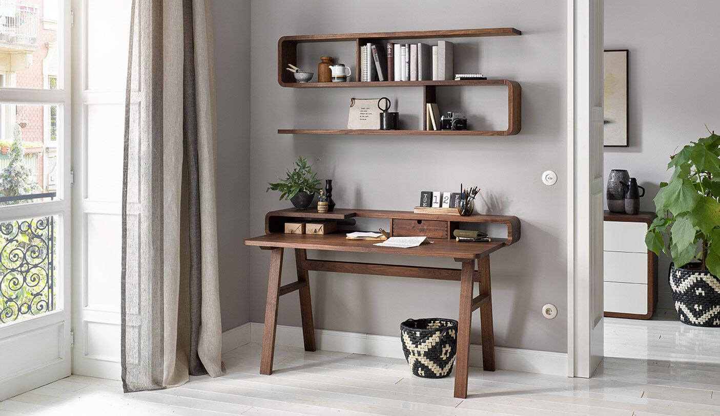 Ein Platz der zum Verweilen einlädt. Naturharzöl und Bienenwachs heben die Struktur und Farbe der verschiedenen Holzarten besonders schön hervor und verleihen dem Sekretär eine angenehme Haptik und eine dauerhaft schöne Oberfläche.